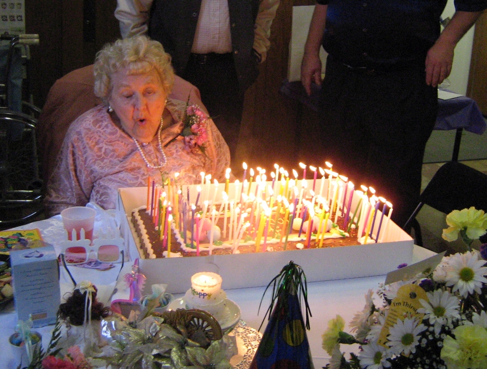 The heart was a fitting symbol for the centenary celebration which saw long-time friends and colleagues greet Mae at the pastel decorated hall of Back River United Methodist Church. Mae’s thick silver hair framed her smiling face as son Danny and daughter-in-law Joyce, who organized the party, stood by her side. Mae was a vision in rose wearing a two-piece lace suit tailored by her friend Marie Rogers.