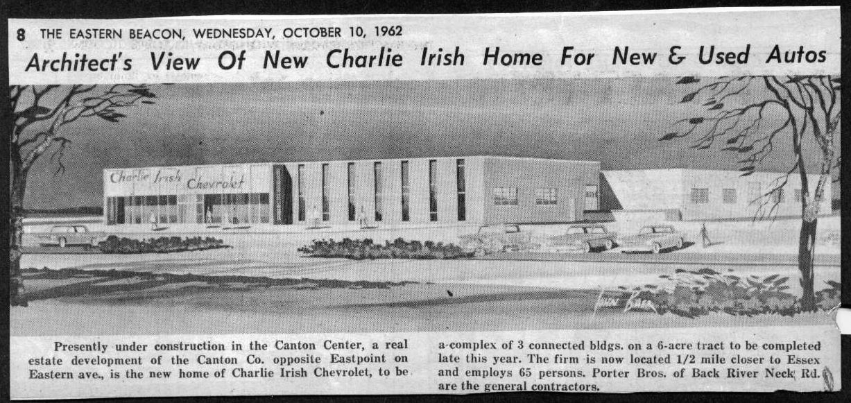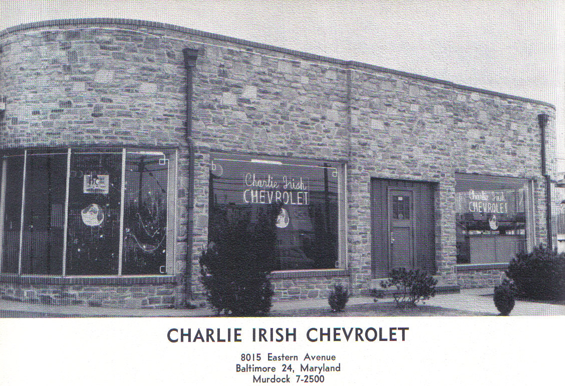Charlie Irish Chevrolet, 1960s-70s clippings Click photos to enlarge. These photos and clippings come from the Heritage Society Baumgartner Archives Book #25 “Eastern Avenue”, scanned by member Rita Gaunt with additional research and photos by archivist Scott Huffines.